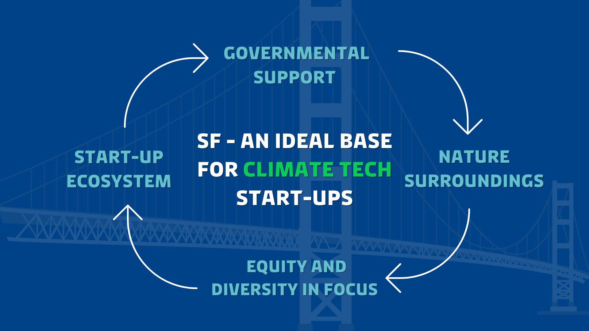 As mentioned earlier, San Francisco is not without its problems. Naturally, there are drawbacks to establishing a business in San Francisco, such as high costs of living and operating expenses, etc. However, when you combine San Francisco’s ideal start-up ecosystem, ambitious carbon-neutral goals, diverse talent, equity values, and incredible nature surroundings, the city has quickly become a frontrunner in the green transition and lays an exceptional foundation for establishing and scaling climate technology businesses. The Climate Action Plan sets the tone for the values of San Francisco, but what truly makes the difference are the diverse and motivated talents that are eager to find a solution towards a sustainable future.